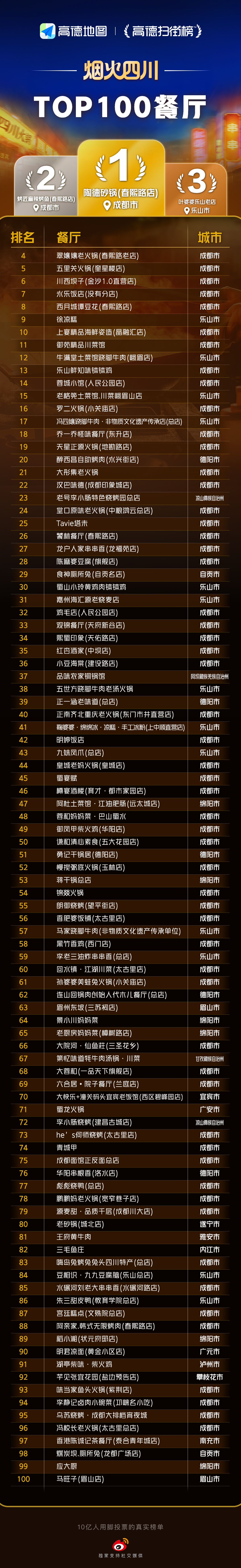 除此之外,高德扫街榜发布的《烟火四川TOP100餐厅》榜单股速查,展现了“到哪都能吃好”的四川美食格局。尽管这些餐厅都位于四川,但却汇集了着眼全球、来自天南海北的各类美食,看到这些餐厅的名字,你的味蕾是不是已经跃跃欲试了呢?赶快出发去探店吧!
