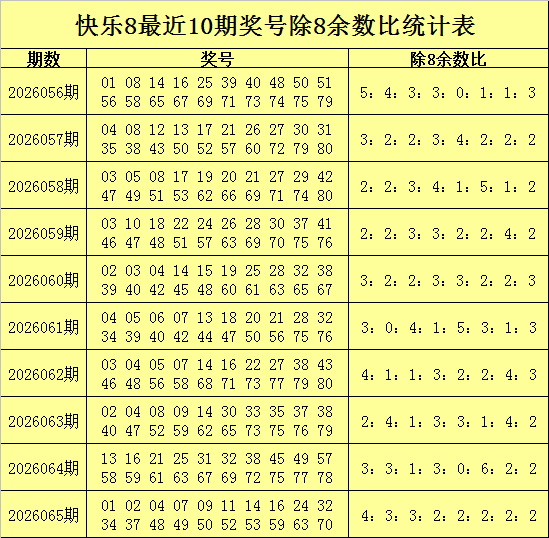 福彩快乐8第2026065期开奖回顾:01 02 04 07 09 11 14 16 24 32 34 37 48 49 50 52 53 59 63 70,其中奖号除8余数比为4:3:3:2:2:2:2:2。